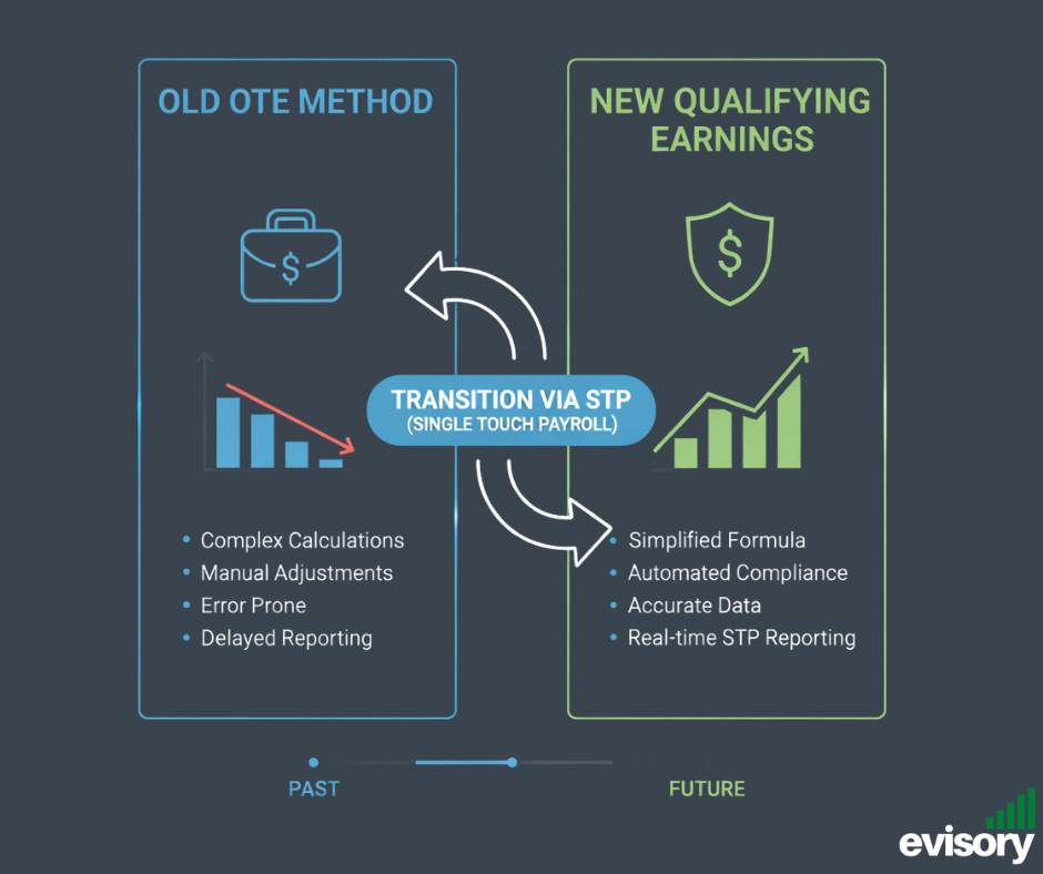 Whereas at present, super is calculated on "Ordinary Time Earnings" (OTE), the new system will calculate on QE. This is designed to simplify what is included in the super calculation, effectively bringing together OTE and other payments (like salary sacrifice) into a single, clearer reporting category for Single Touch Payroll (STP).